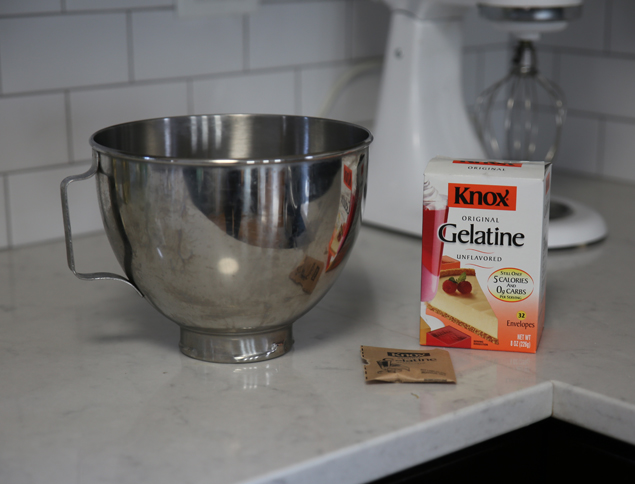 Take 1/4 cold water and put it in your mixing bowl. Sprinkle the gelatin on top and let it set while you move on to the next step.