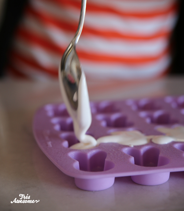 Now work quickly and spoon the marshmallow into your bunny form. You only have a limited amount of time before the gelatin sets.
